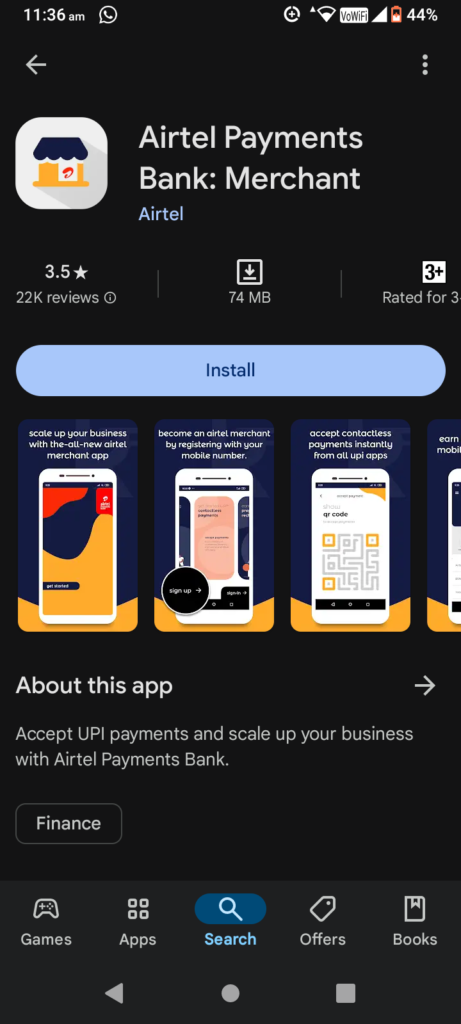 Airtel Payments Bank App ऐप में आप अपने मोबाइल नंबर का इस्तेमाल करके रजिस्टर कर सकते हैं और कुछ मिनट में ही एयरटेल मर्चेंट बन सकते हैं, जहां से आपको अपनी दुकान अथवा व्यवसाय के लिए एक कस्टमाइज QR Code मिल जाएगा, जिससे आप 140+ UPI Apps से पेमेंट प्राप्त कर सकते हैं और मोबाइल तथा प्रीपेड रिचार्ज कर सकते हैं। आपको प्रत्येक ट्रांजैक्शन पर पैसे मिलेंगे, जिन पैसों को आप अपने अकाउंट में ट्रांसफर कर सकते हैं।